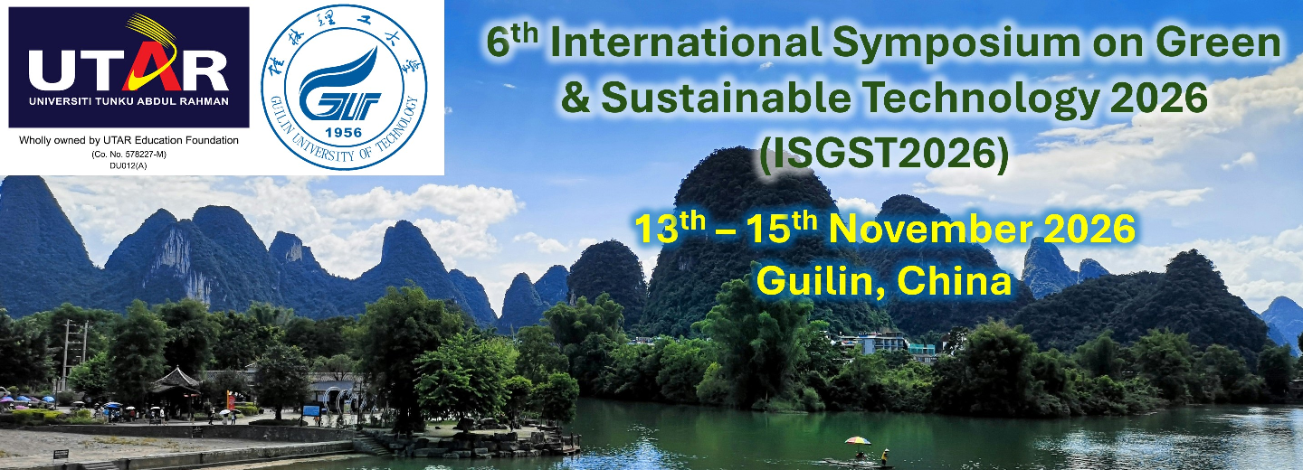 The 6th International Symposium on Green & Sustainable Technology 2026 (ISGST 2026) will be held from 13th to 15th November 2026 at Guilin University of Technology, Guilin, China. This three-day event is jointly organized by Guilin University of Technology (GLUT) and the Centre of Environment and Green Technology (CEGT), Universiti Tunku Abdul Rahman (UTAR). With the theme “Empowering a Sustainable Tomorrow through Green Tech Breakthroughs,” ISGST 2026 aims to bring together professionals from academia and industry across multiple disciplines to exchange ideas, share experiences, and present the latest research in green and sustainable technology. The symposium will cover a wide range of topics including renewable energy technology, environmental technology, green materials and sustainable development—all focused on advancing sustainable solutions for a greener future. ISGST 2026 also offers researchers valuable opportunities to showcase their scientific findings and emerging technologies, expand their research networks, and engage in meaningful academic discussions. All accepted papers will be published in conference proceedings indexed by SCOPUS and EI Compendex.